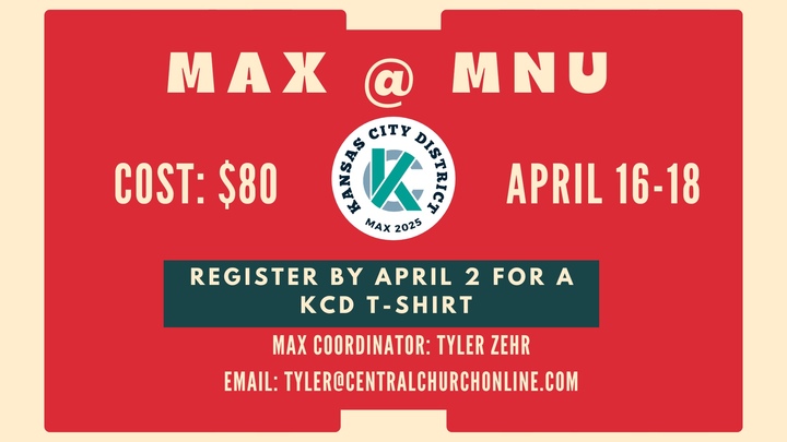 Registration fee: $85 if paid online or $80 paying through your local church. Local churches, for anyone not paying online, please take one check made out to "KCD NYI" to the district huddle on the first day of MAX.